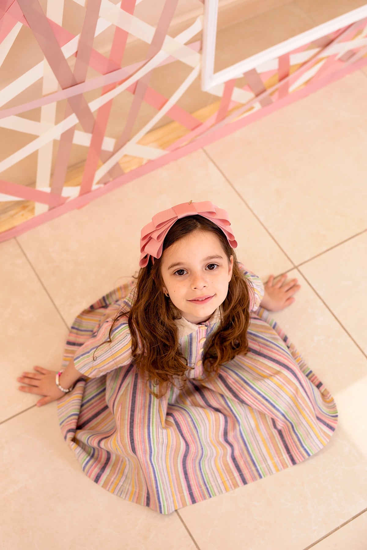 I fell in love with petersham ribbon, which is similar to grosgrain ribbon but has a scalloped-like edge, when we made our Grosgrain Bow Clip Sets. I wanted to create a collection using Petersham Ribbon. The first headband we made was this one! This headband's inspiration came from two of our other popular styles: Heather and Pleated Ribbon. It was created using wide ribbon formed in uneven loops to create this lovely style! Look how it looks on our models!