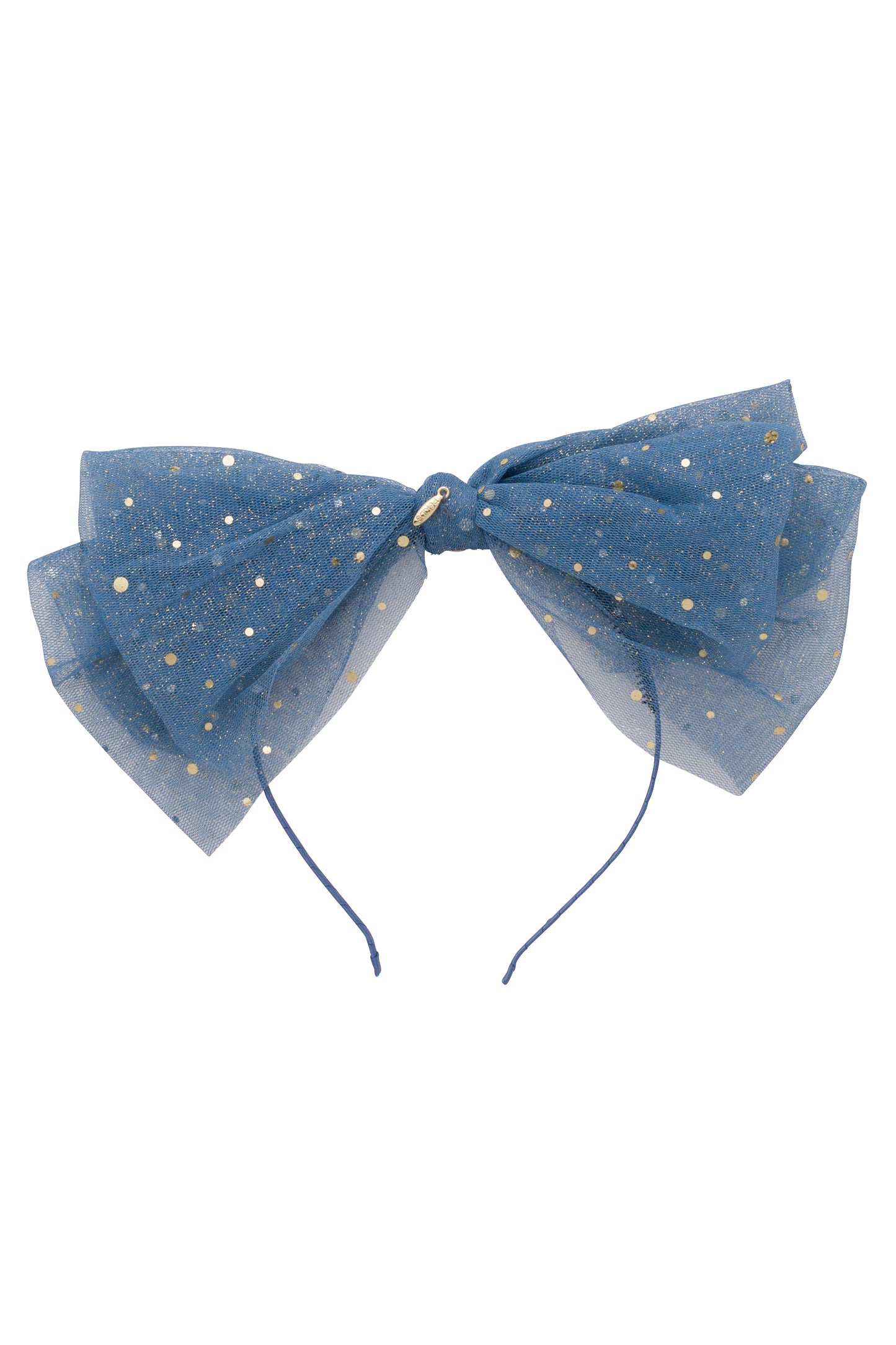 Ava Dot Headband is a fine tulle bow with small gold dots on a headband or hair wrap.