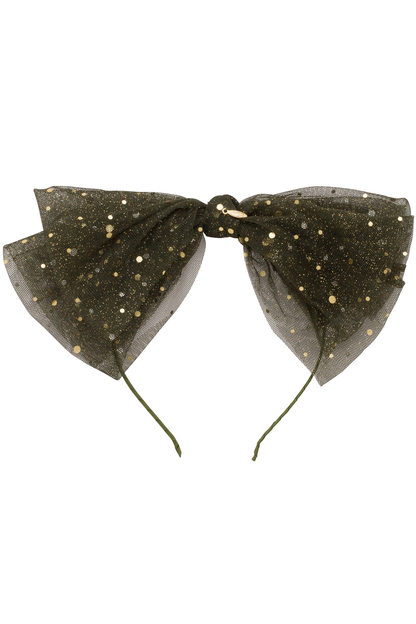 Ava Dot Headband is a fine tulle bow with small gold dots on a headband or hair wrap.