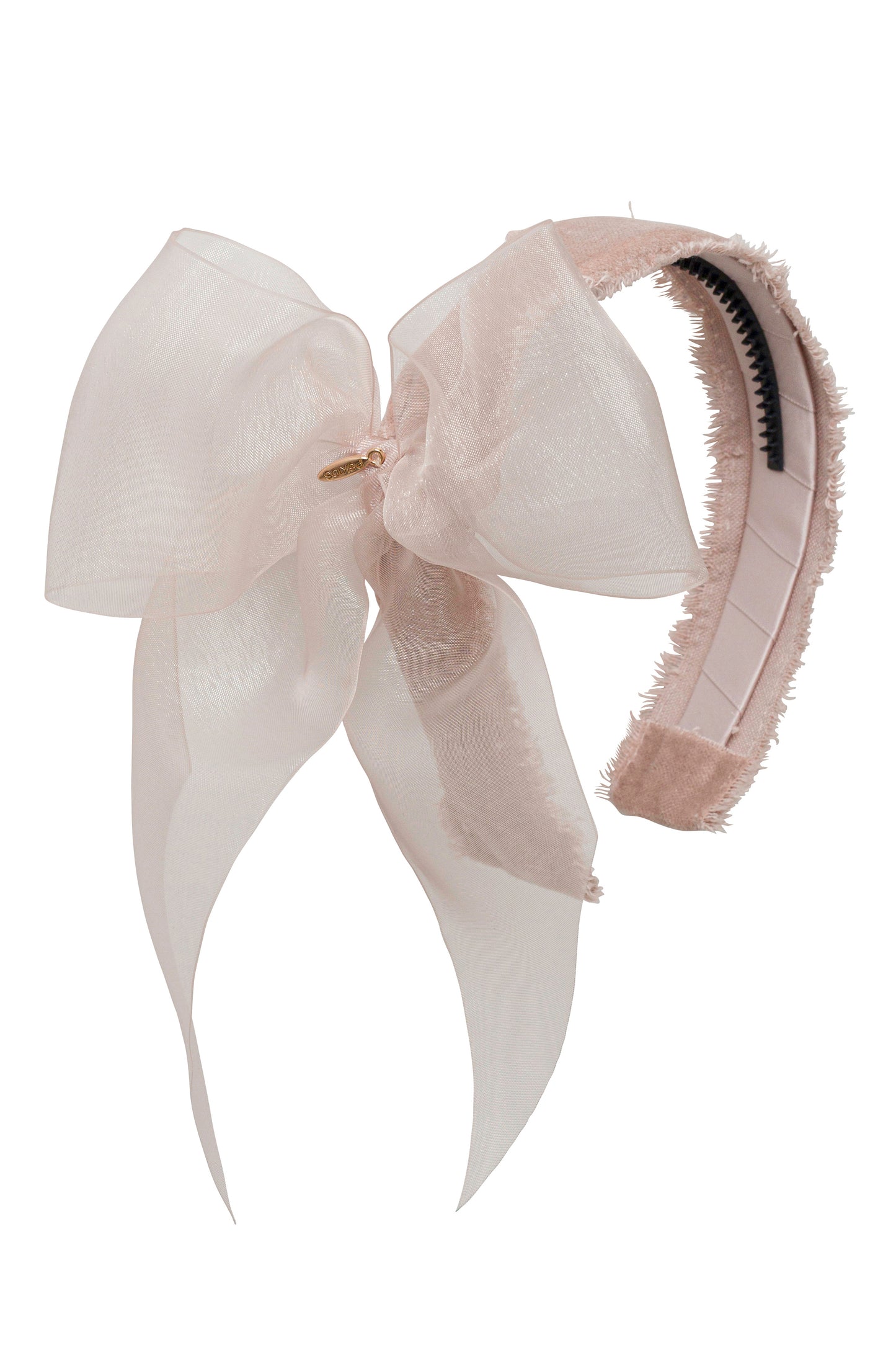 A stunning oversized organza bow on a headband covered in a velvet-like fringe material.