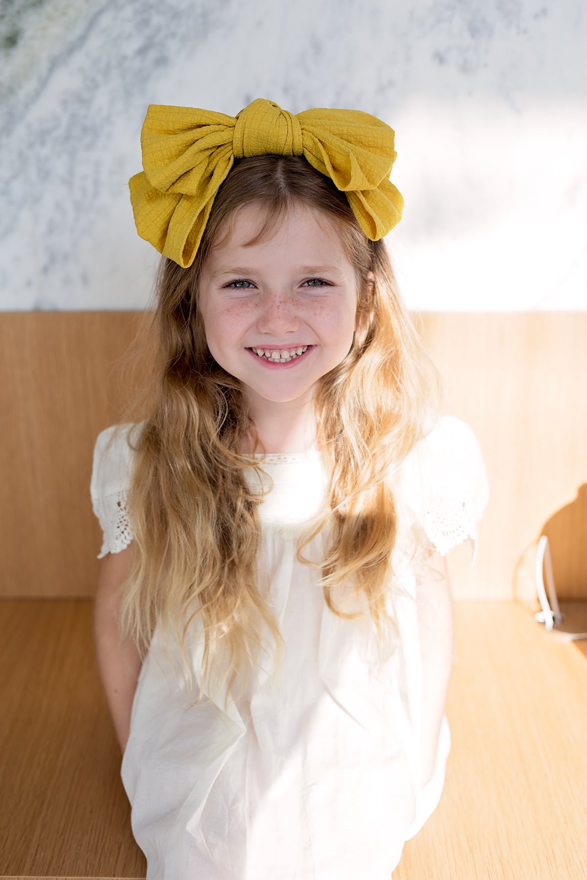 Folded Layers of muslin gauze forming an oversized bow on a hard headband.