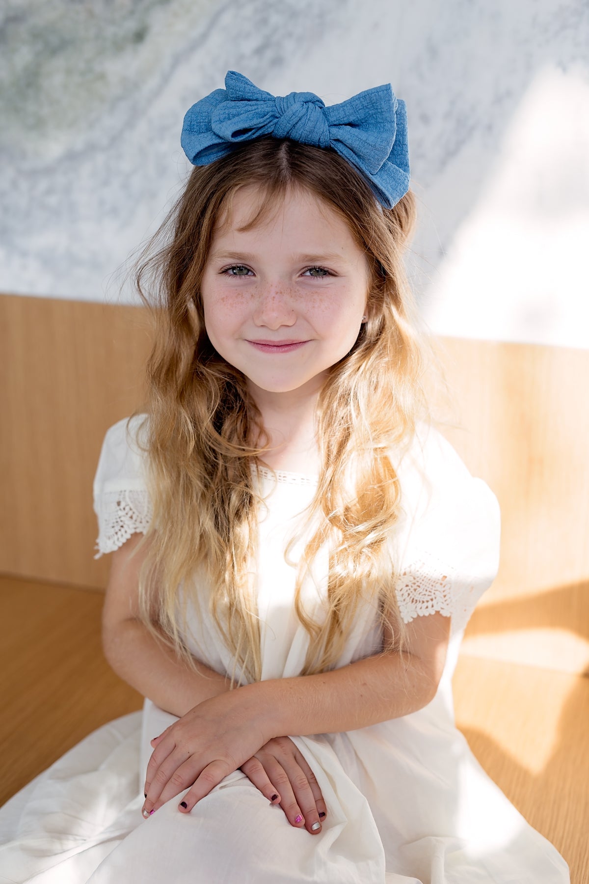 Folded Layers of muslin gauze forming a bow on an adjustable wrap.