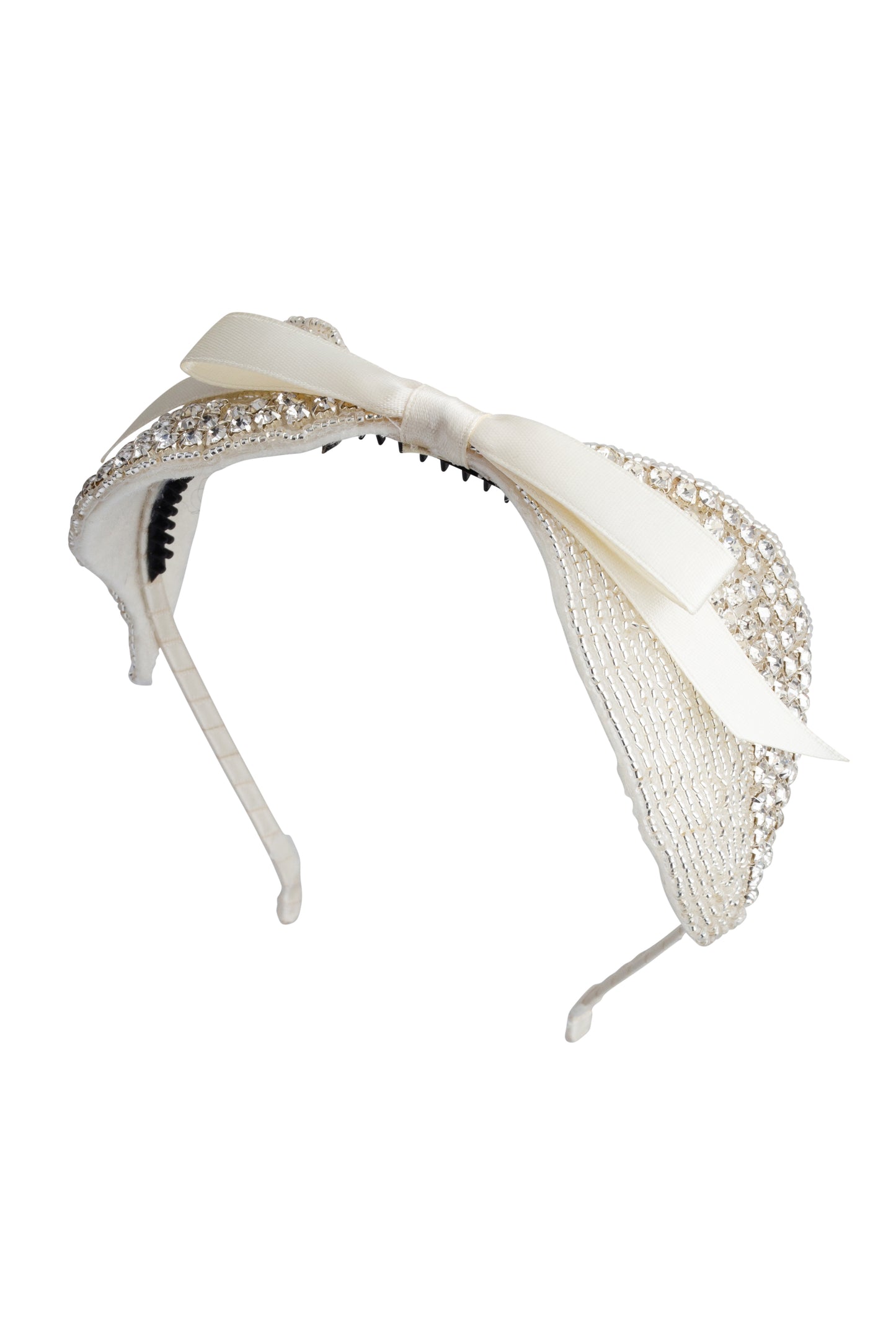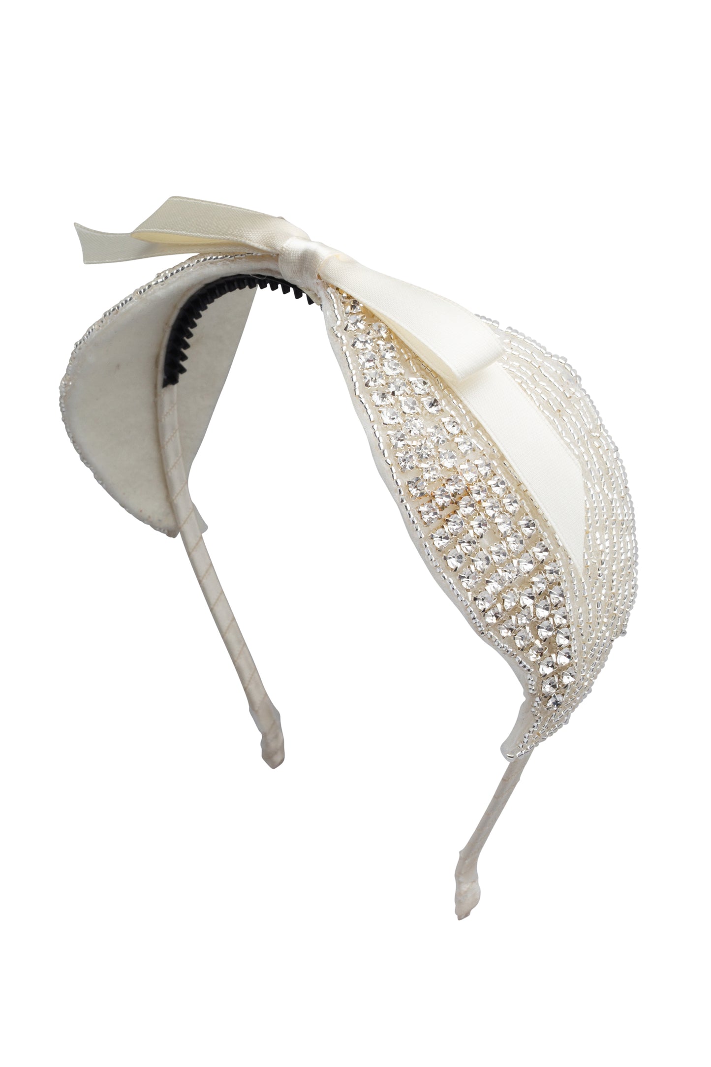 Beads and Zircona crystals cover the curved leaf/bow petals on each side of the headband. The headband is topped with a satin bow.