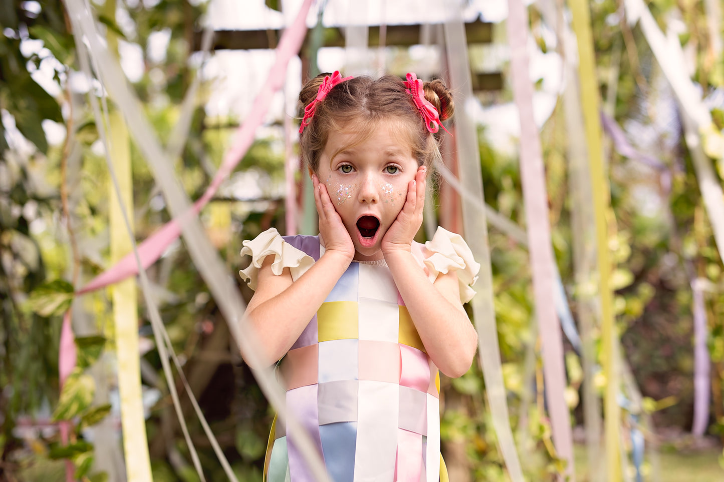 Scalloped edged grosgrain ribbon created a double looped bow with dangling ribbon. Each loop is made with three layers of ribbon. Comes on an alligator clip. Size is about 3.5".
