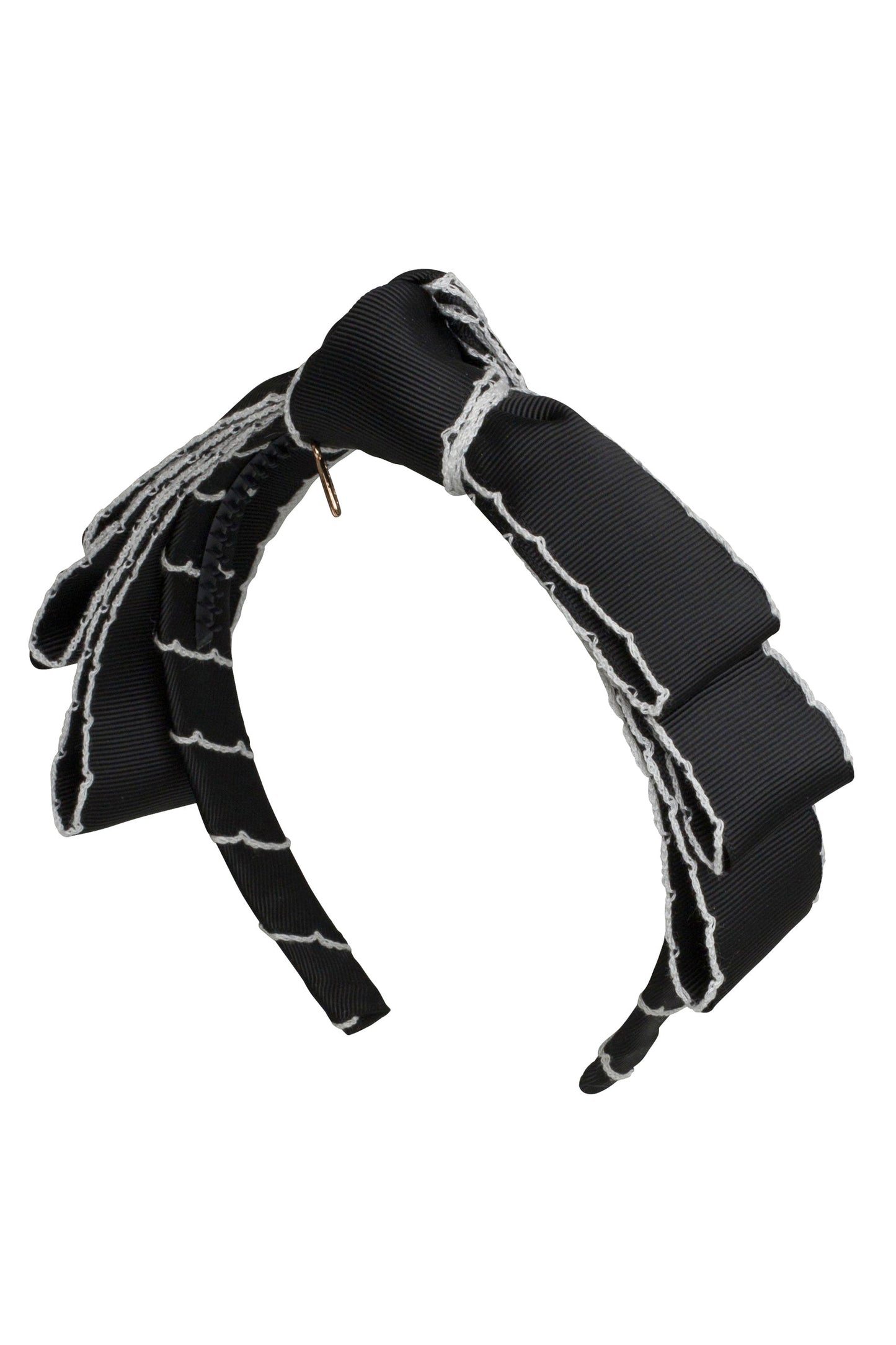 This headband brings together two beloved designs—the structured layers of our Heather Headband and the effortless elegance of a classic knot. Made from grosgrain ribbon with delicate moon-stitched edging, it features a a triple layer bow with a knot at its center.