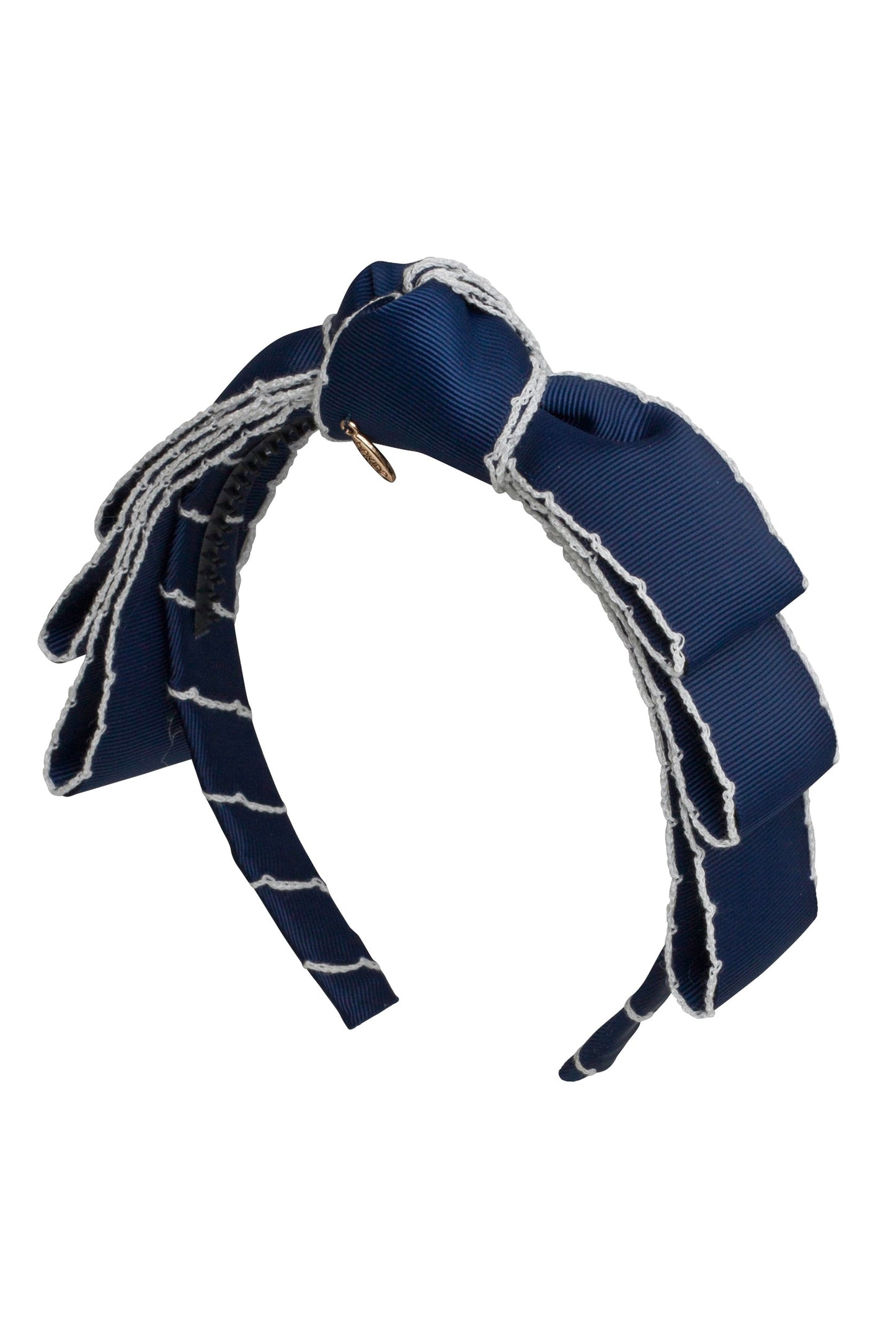 This headband brings together two beloved designs—the structured layers of our Heather Headband and the effortless elegance of a classic knot. Made from grosgrain ribbon with delicate moon-stitched edging, it features a a triple layer bow with a knot at its center.
