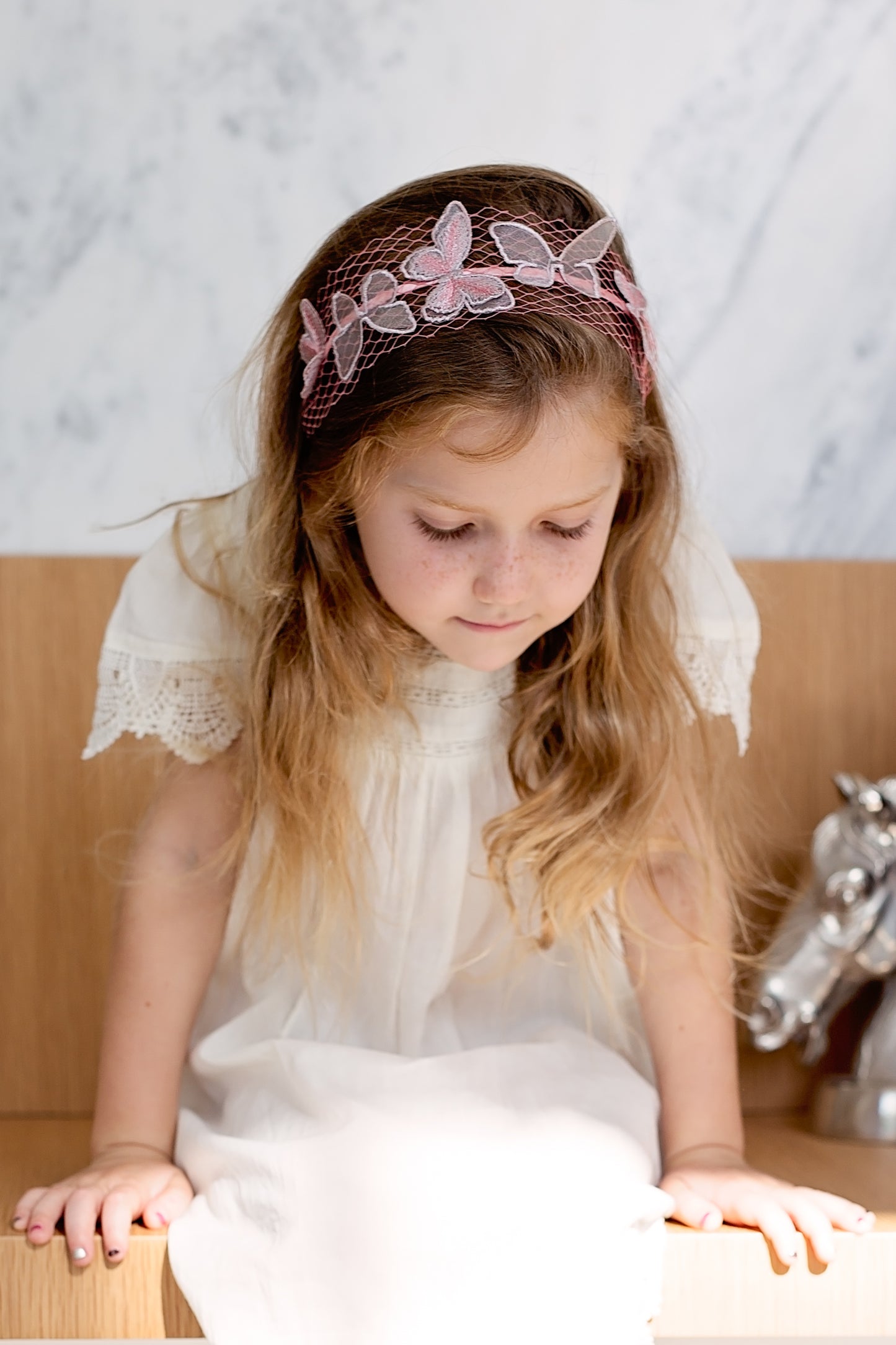 Narrow headband with a layer of mesh fabric on top. Delicate appliques of butterflies placed around the headband