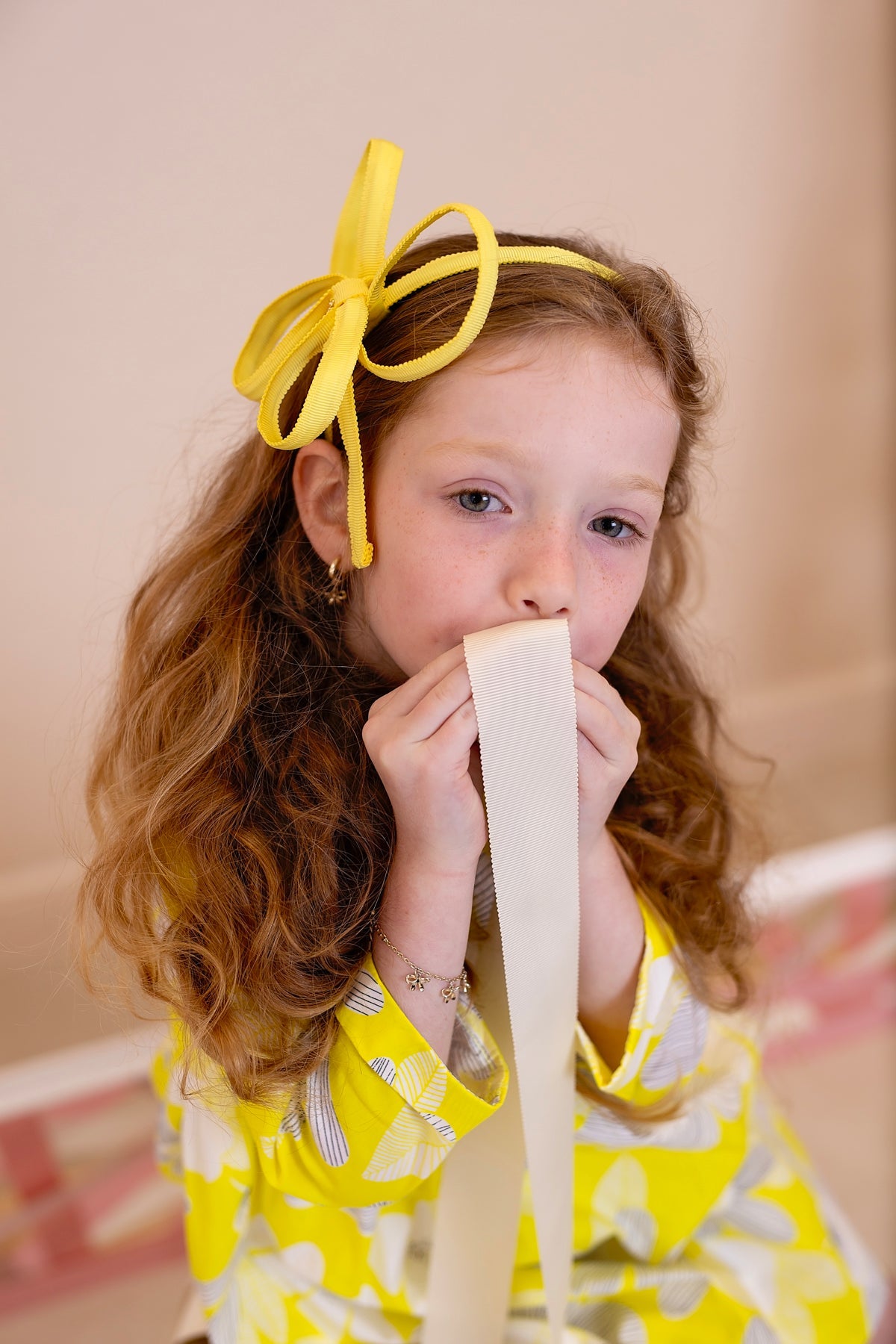 Is it a bow or a flower or a butterfly? Well, that's up to you! This unique headband has a sturdy flat "wire" going through it so you can move the loops to create a bow or a butterfly or maybe an orchid! It will arrive looking like a double bow. While it might seem like a super large headband, it actually isn't so big looking when it's on! We even let our almost 3-year-old model try it! Look how cute it is!!