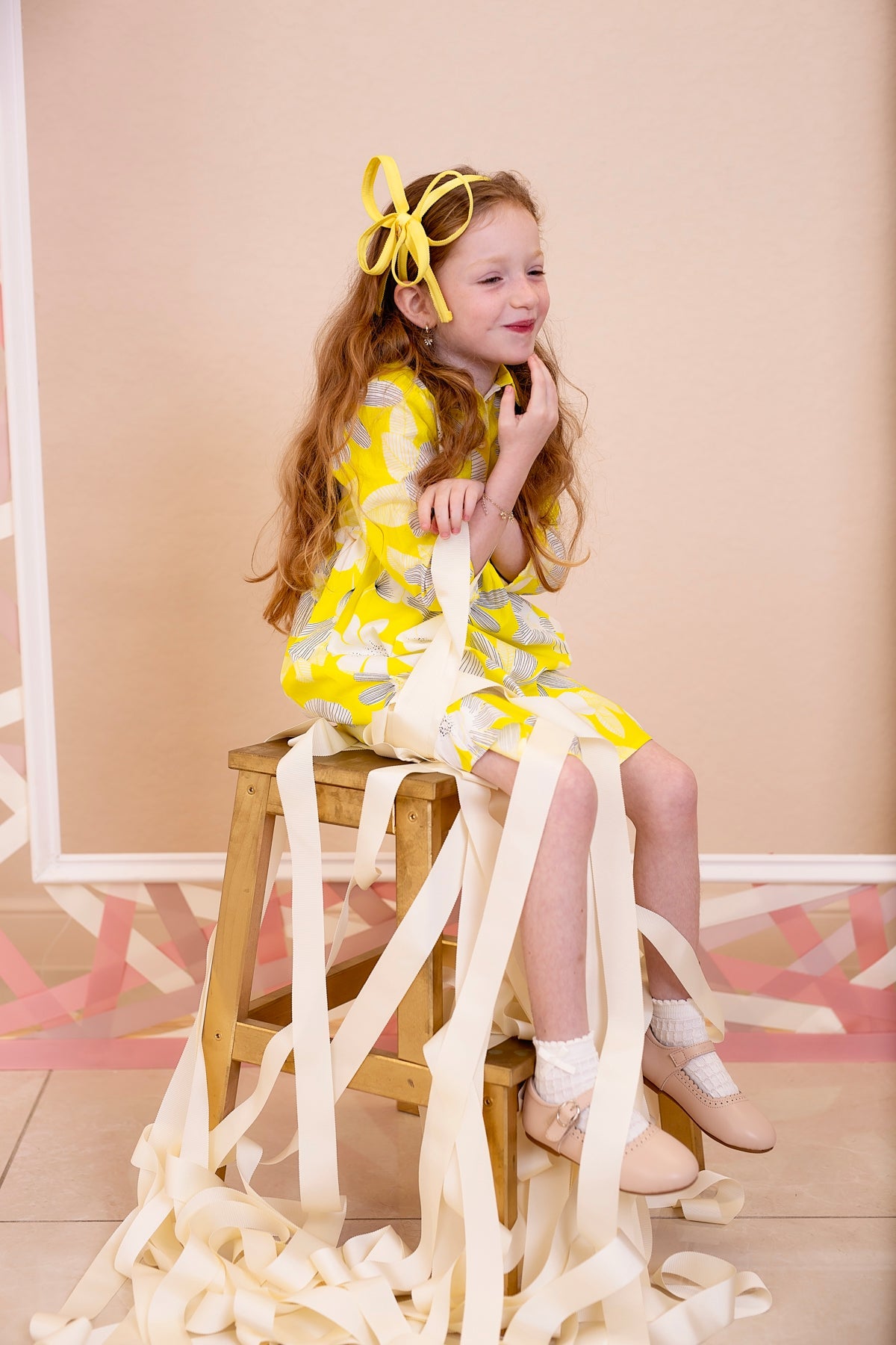 Is it a bow or a flower or a butterfly? Well, that's up to you! This unique headband has a sturdy flat "wire" going through it so you can move the loops to create a bow or a butterfly or maybe an orchid! It will arrive looking like a double bow. While it might seem like a super large headband, it actually isn't so big looking when it's on! We even let our almost 3-year-old model try it! Look how cute it is!!