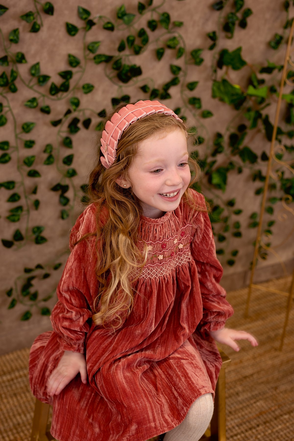 This luxurious looking style is perfectly and pristinely pleated velvet ribbon. The center has a narrower ribbon crossing the pleats to complete the look.