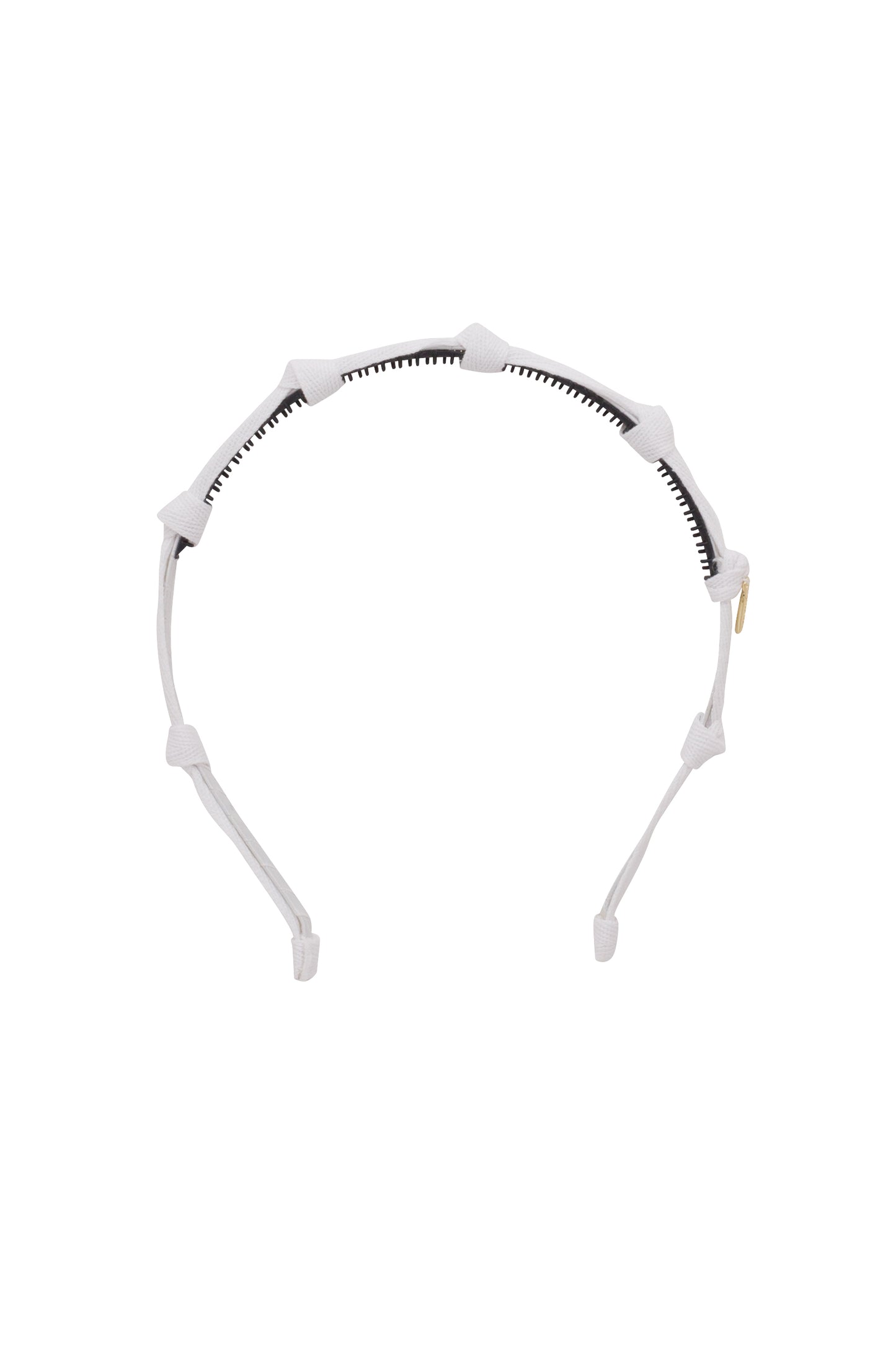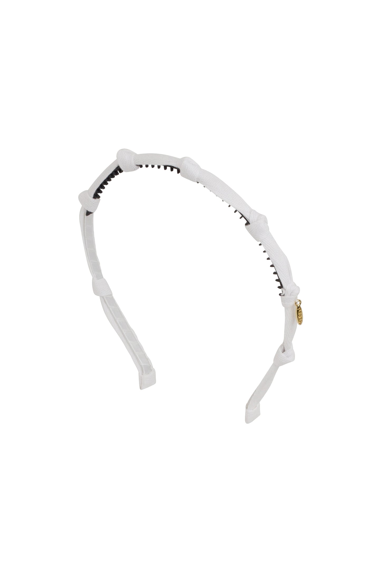 I absolutely love the simplicity of this design. It's little rosebud knots on a thin narrow headband. Wear one at a time or stack them! We have them now in velvet and this cotton herringbone fabric. Such a great staple!