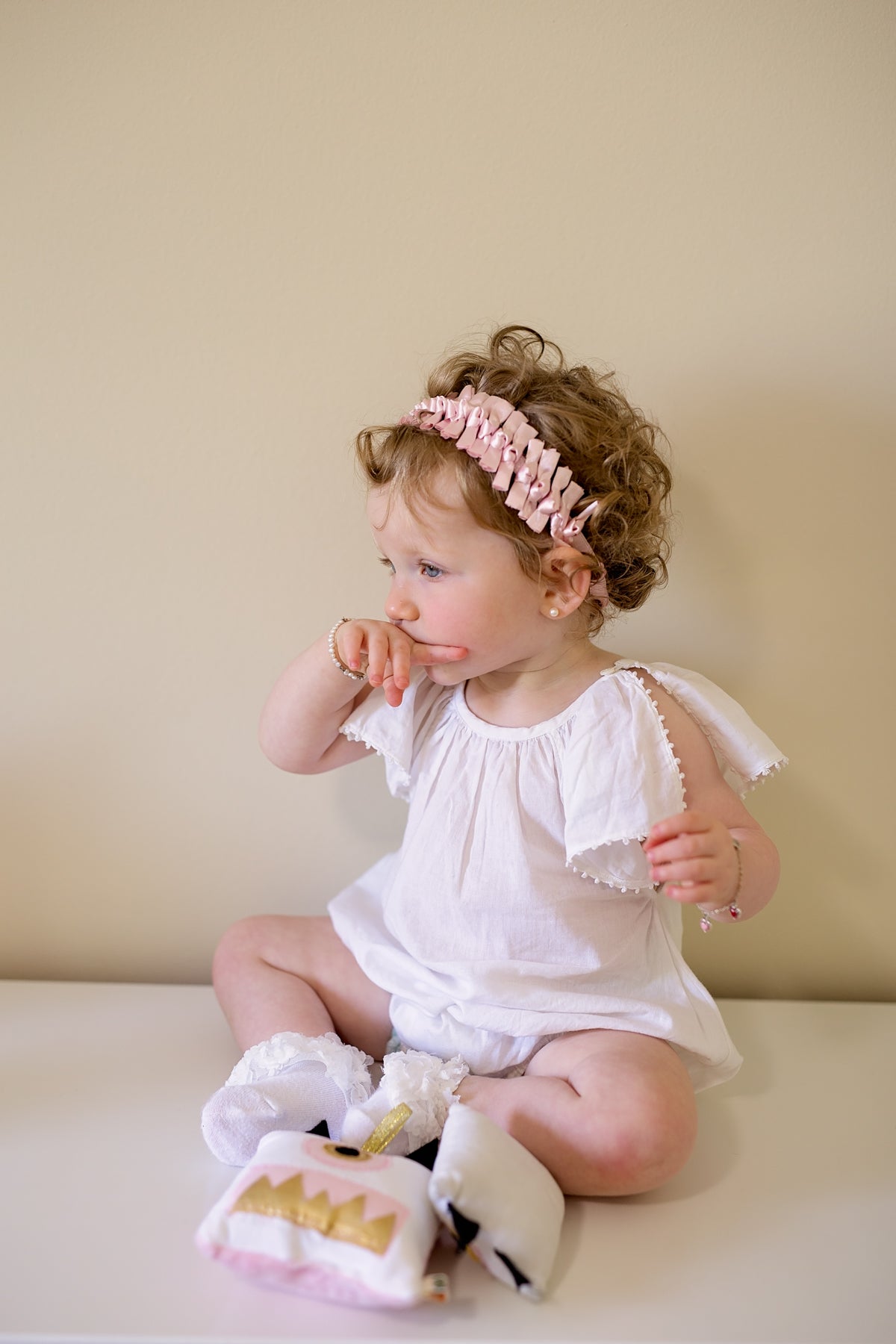 Strips of satin knotted and placed around an adjustable wrap. Perfect for baby or girls.