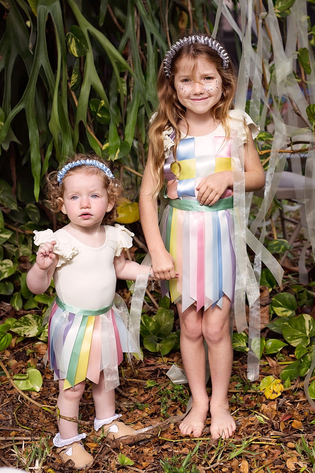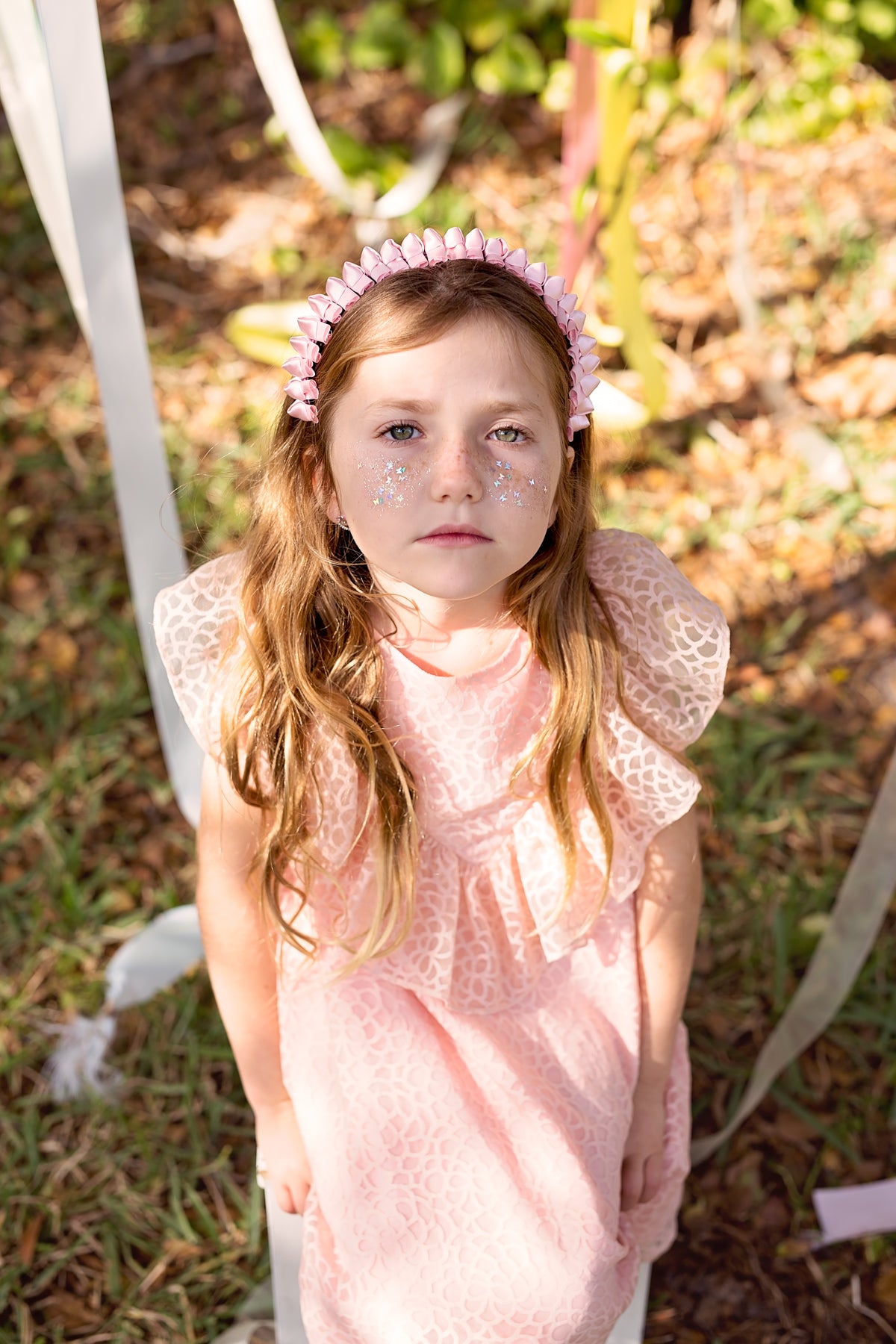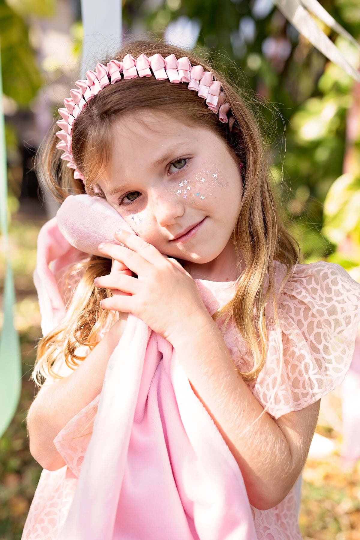Strips of satin knotted and placed around a hard headband.