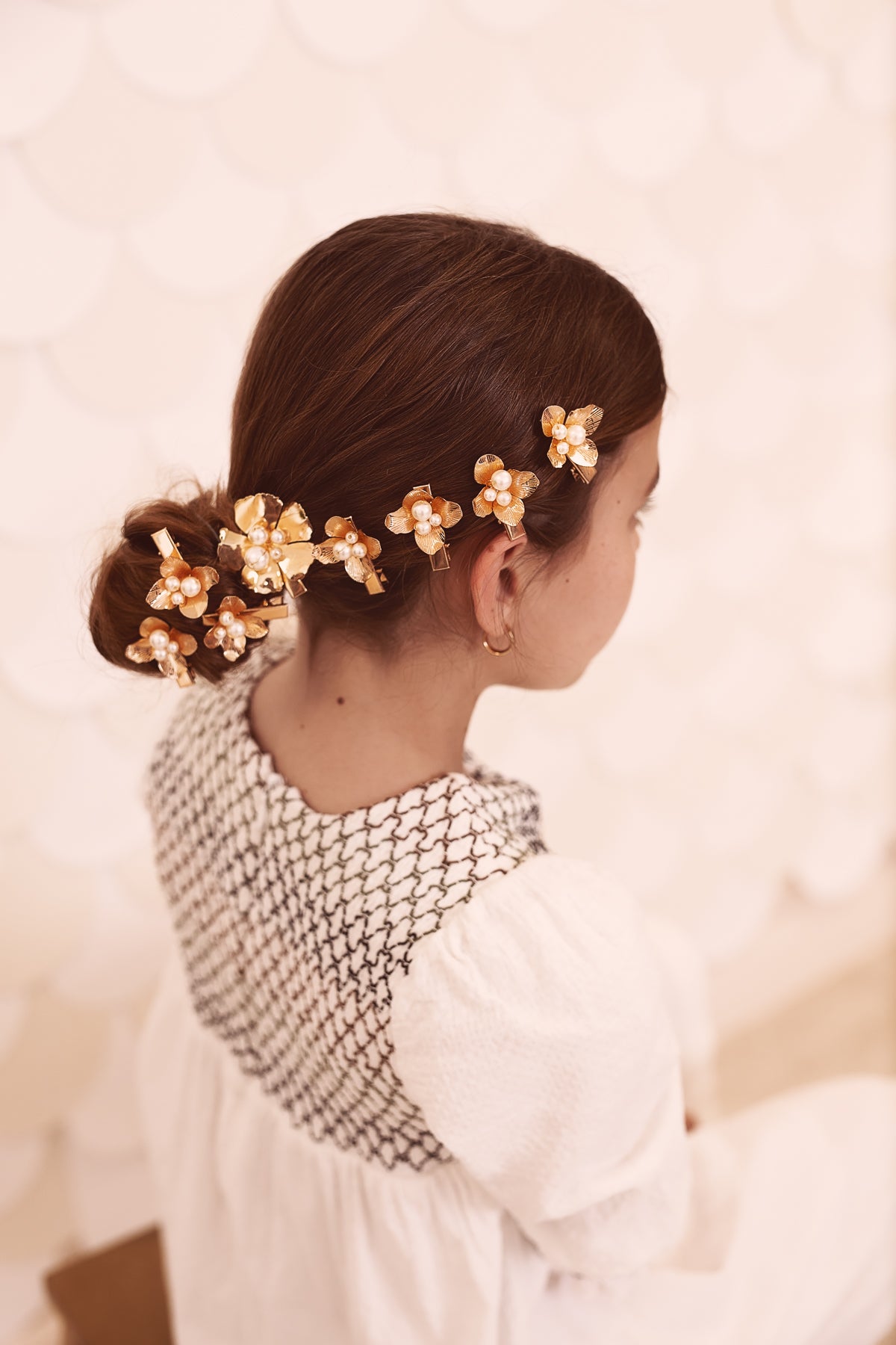 A luminous touch for any hairstyle, these delicate floral clips capture the beauty of sun-drenched petals. Crafted with a radiant gold finish, each bloom is adorned with a trio of lustrous pearls, creating a soft contrast against the sculpted metal.