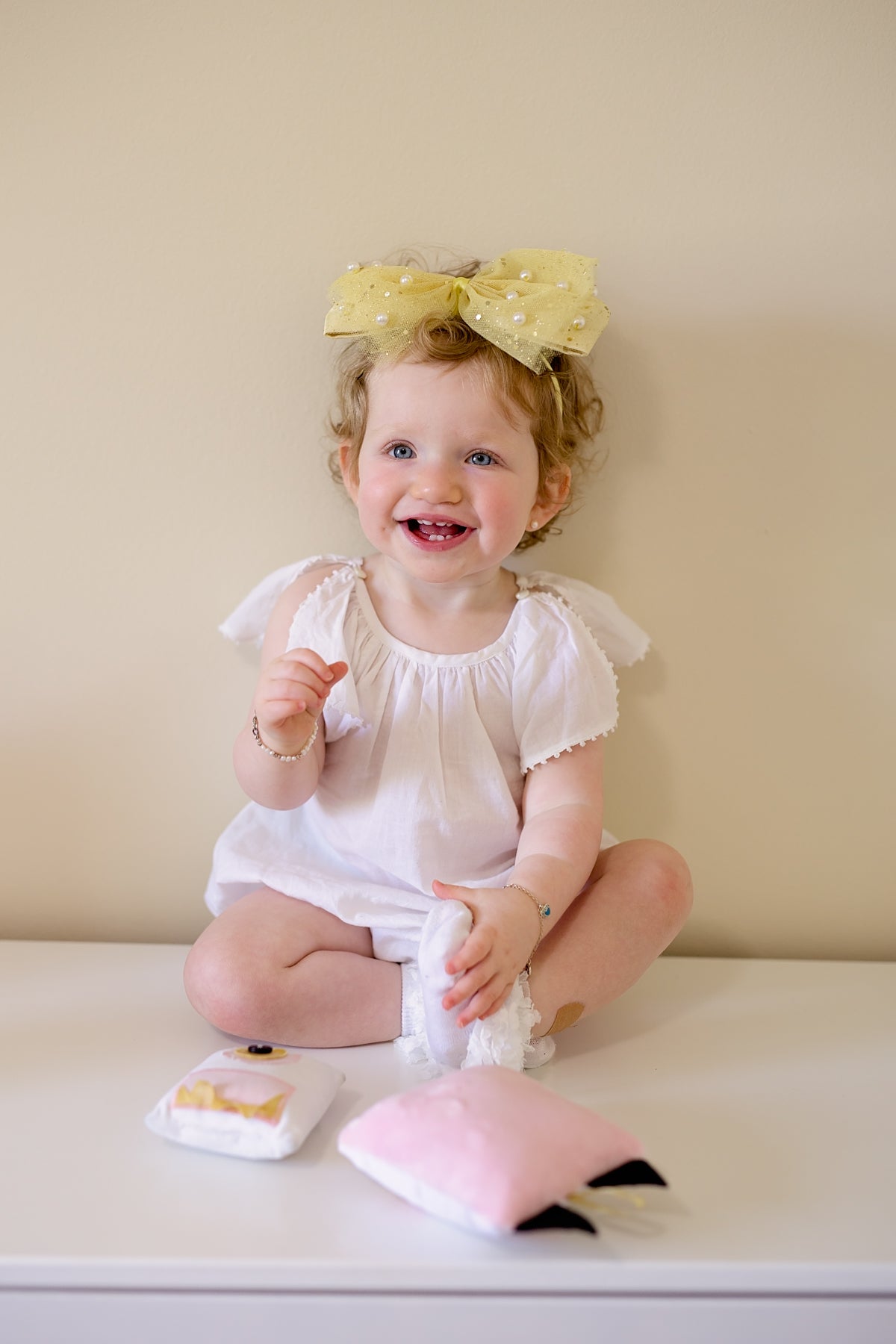 Wide Satin Stiff Bow covered in tulle with Pearls sewn on in a scattered fashion. Extra layers of tulle with pearls form a bow on top.
