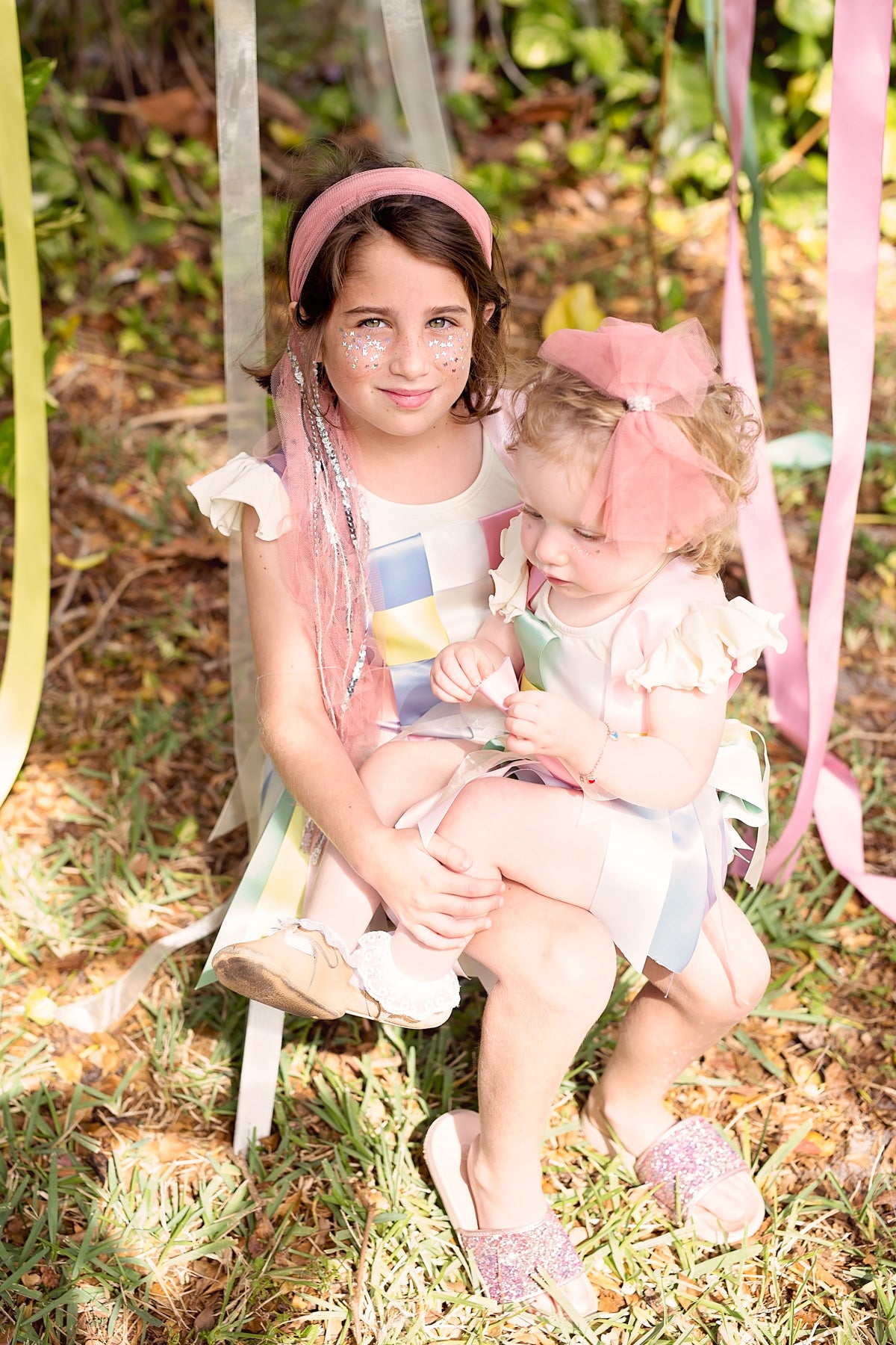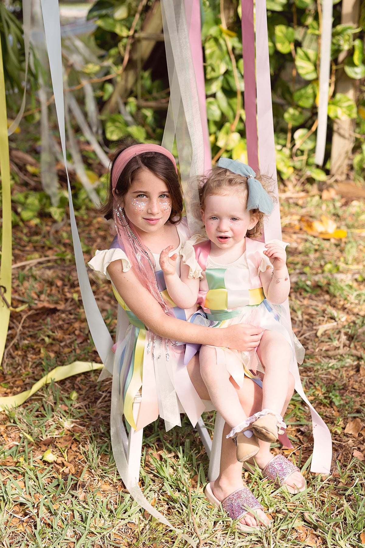 A tulle wreath/wrap made with layers of tulle. The adjustable closure has ribbons, sequins, and strips of tulle dangling.